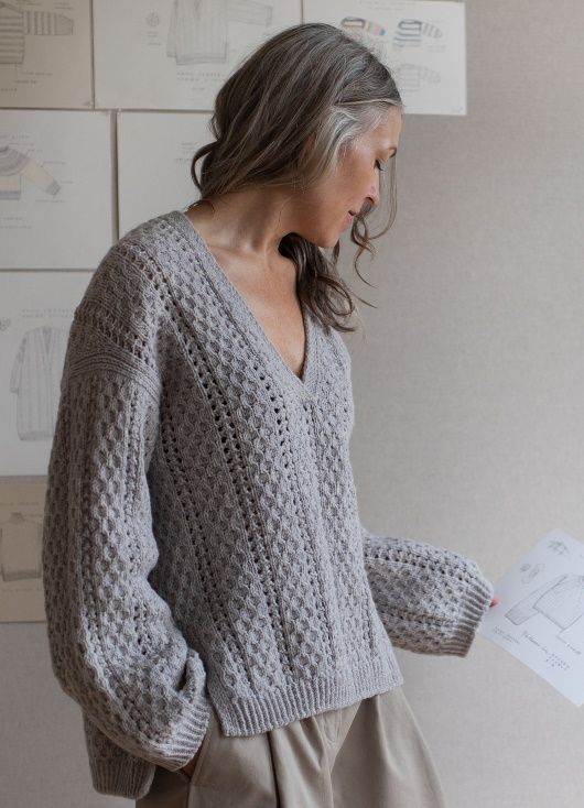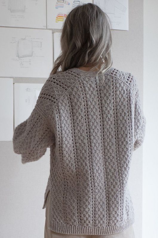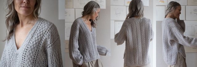 Comma - женственный вязаный свитер оверсайз с элегантным сочетанием кос и ажура. Свитер вяжется без швов сверху вниз. Сначала вяжется воротник спинки, а затем кокетка спинки. После этого петли поднимаются и вяжутся обе стороны переда. Спинка и перед соединяются в нижней части проймы, и тело вяжется по кругу до тех пор, пока петли для переда и спинки снова не разделятся, чтобы получились боковые разрезы. В конце петли поднимаются и вяжутся рукава по кругу.