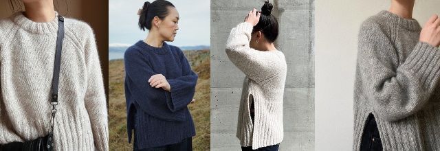 Вязаный свитер Eun выполнен регланом с высокими разрезами по бокам вяжется сверху вниз от горловины. Планка горловины вяжется резинкой и складывается вдвое, укороченными рядами формируется вырез горловины. Корпус вяжется вкруговую и затем разделяется на перед и спинку, которые вяжутся резинкой поворотными рядами.