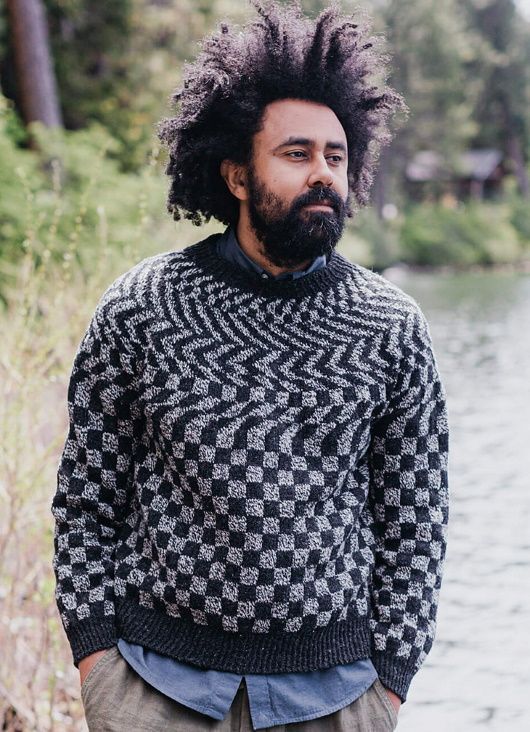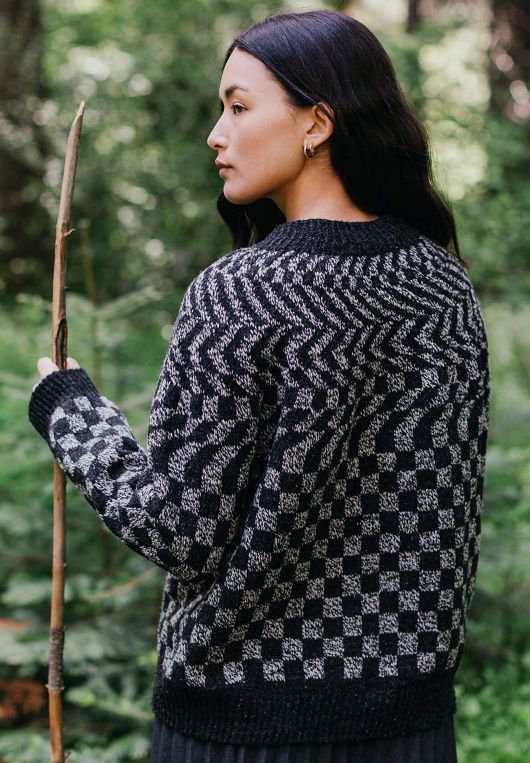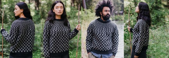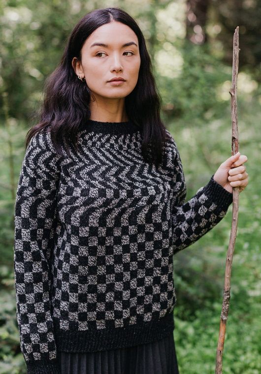 Вязаный свитер Glastonbury выполнен в особой технике геометрическим узором. Тело и рукава изделия связаны по кругу, начиная от нижнего края и вверх, и соединяются на уровне подмышек, затем кокетку вяжут по кругу до горловины. Горловину формируют укороченными рядами.