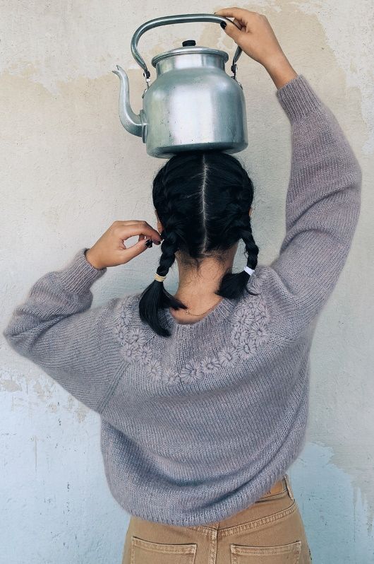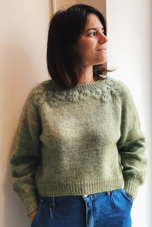 Свитер Grinalda связан сверху вниз по кругу до нижнего края, с прибавками вдоль линий реглана. Укороченные ряды вяжут в начале для формирования горловины и также в нижней части тела для того, чтобы спинка была длиннее переда. Верхнюю часть свитера вы можете украсить вышитыми цветами (по желанию).