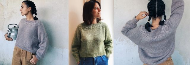 Свитер на фото связан из пряжи Vovó 23 (оттенок светло-серый) и Isager Silk Mohair 62 (пыльно-розовый).