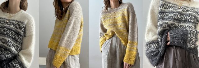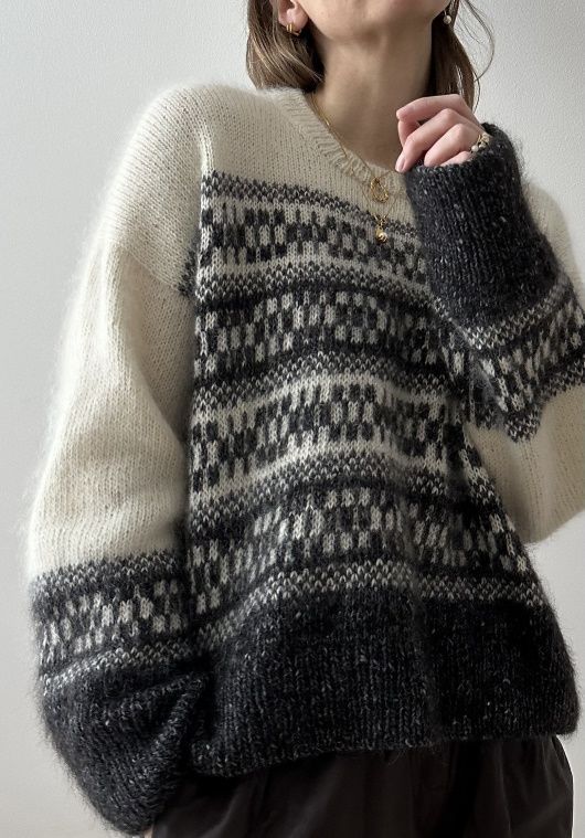 Свитер JohanneLoop связан сверху вниз. Сначала вяжут перед и спинку прямо, затем соединяют в круг для вязания тела. Для рукавов поднимают петли по краю пройм и рукава вяжут по кругу. Чтобы получить хорошую посадку, укороченные ряды вяжут в верхней части спинки, на плечевых скосах и на рукавах. Тело и нижнюю часть рукавов вяжут двухцветным узором по схеме.