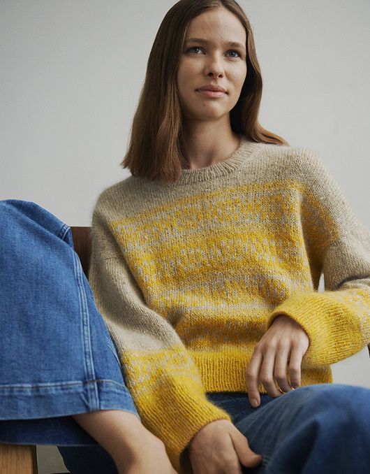 На фото свитер в оттенках песок/желтый показан в размере S с прибавкой на свободное облегание 28 см.