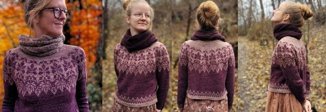 Вязаный свитер Lorien выполняется сверху вниз по кругу. Цветочный мотив вяжется в технике затухающего узора с использованием пряжи двух цветов.