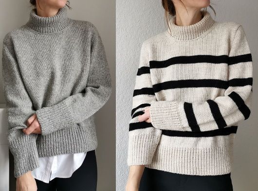 Позже отделить рукава и завершить корпус по кругу, а затем завершить рукава. Наконец, для выреза горловины поднять петли и, как и манжеты рукавов и нижняя кайма, вяжутся полу- рыбацкой резинкой, при этом «изнаночная» сторона резинки является лицевой стороной. Свитер можно вязать в один цвет или с полосками.