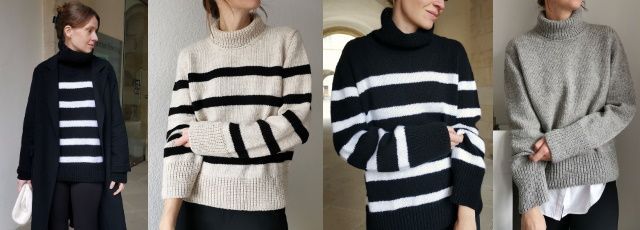 Maxime - это вязаный свитер оверсайз с широкими рукавами и характерными планками и манжетами резинкой. Свитер вяжется сверху вниз. Сначала, верхняя часть спинки вяжется поворотными рядами, а наклонные плечи формируются с помощью прибавок. Затем правая и левая детали переда вяжутся от плеч спинки. Перед соединением двух полочек и спинки с боковых краев полочек набираются петли для рукавов. Работа продолжается поворотными рядами, пока не сформируется вырез горловины, одновременно прибавляя для рукавов. После соединения работы для вязания по кругу в дополнение к прибавкам рукава прибавлять для тела, аналогично свитеру реглан.