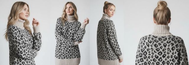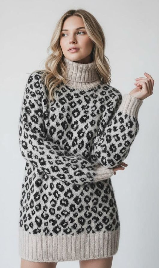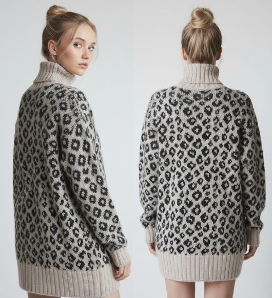 Miu – о это классический удлиненный вязаный свитер с леопардовым принтом, который будет актуален из года в год. Жаккардовое полотно плотное и теплое, а сам свитер должен быть свободным и повседневным. Оверсайзный и модный, он достаточно длинный, чтобы закрывать бедра. Другими словами, не забудьте измерить бедра и проверить размер. Если в области бедер кажется слишком тесным, а размер больше будет слишком свободным в груди, просто сделайте его короче.