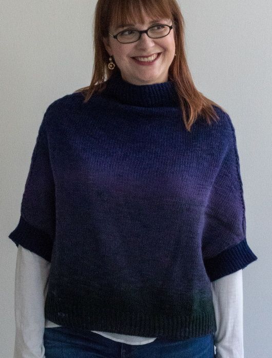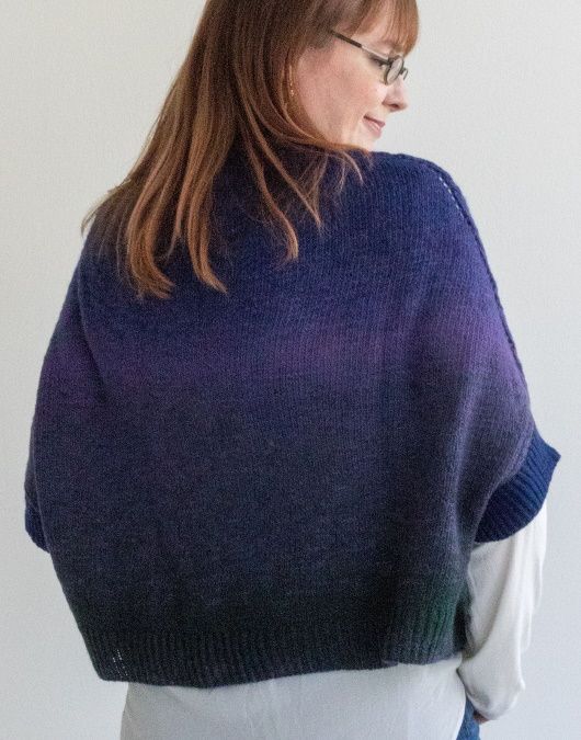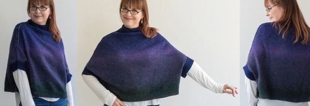 Свободный свитер Notturno с комфортной посадкой, связанный сверху-вниз одной деталью. Начиная от горловины, прибавки, придающие форму кокетке, скрыты в узоре из мелких кос, украшающем плечи. В конце кокетки, перед и спинку отделяют для создания пройм, затем перед и спинку снова соединяют и продолжают вязать свободное тело по кругу. Петли для коротких рукавов поднимают вокруг пройм. Все окантовки выполнены скрещенной резинкой. Особый цветовой эффект создается при использовании градиентной пряжи с очень длительными, постепенными изменениями цвета.
