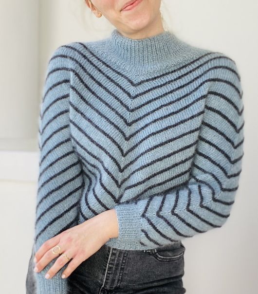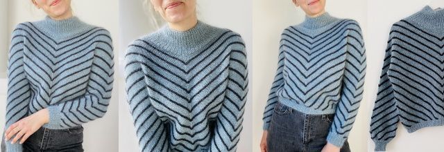 Вязаный свитер Pauline с диагональными полосками. Свитер вяжется сверху вниз с прибавками реглана, но прибавки реглана выполняются по центрам передней и задней части и в центре рукавов. Такой способ создает узор из диагональных полос, пересекающихся в центрах деталей.