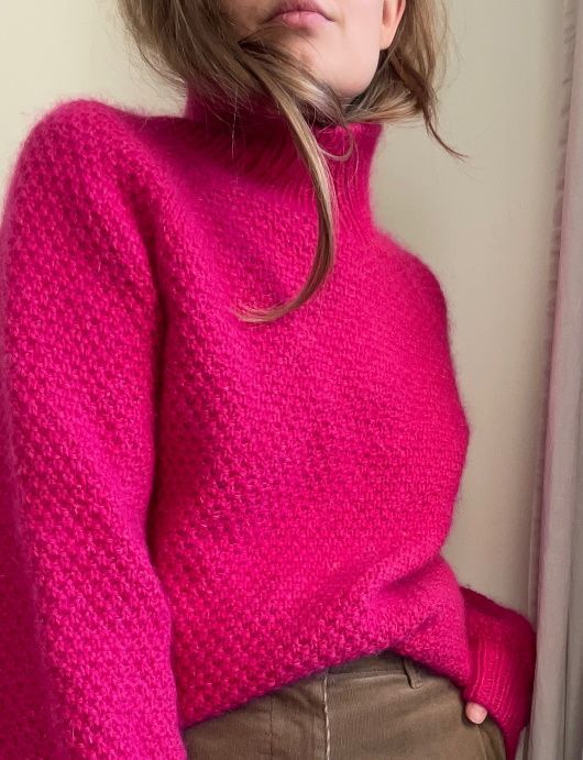 Свитер Ppoppo — это модель слегка oversize, выполненная непрерывным узором «двойной жемчужный» по всему полотну. Свитер вяжется сверху вниз, одновременно с формированием горловины используются немецкие укороченные ряды (GSR). Свитер не требует дополнительной финишной обработки.