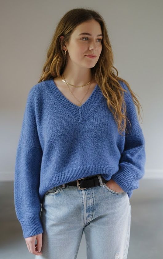 Свободный V-образный свитер — это модель, связанная сверху вниз, с объемным, прямоугольным силуэтом, спущенным плечом и глубоким V-образным вырезом. Кокетка спинки формируется с помощью немецких укороченных рядов для лучшей посадки, затем поднимаются петли и вяжутся плечи одновременно с формированием выреза горловины. Перед и спинка соединяются, и тело вяжется по кругу, а рукава поднимаются по проймам и вяжутся сверху вниз. Разработанная с утрированными пропорциями, эта модель идеально подходит для многослойных образов поверх обычной футболки.