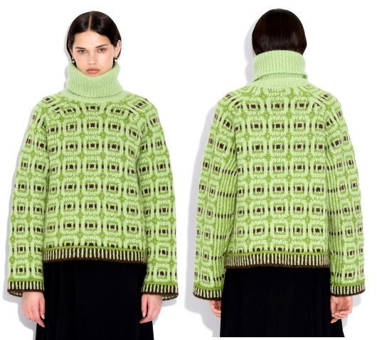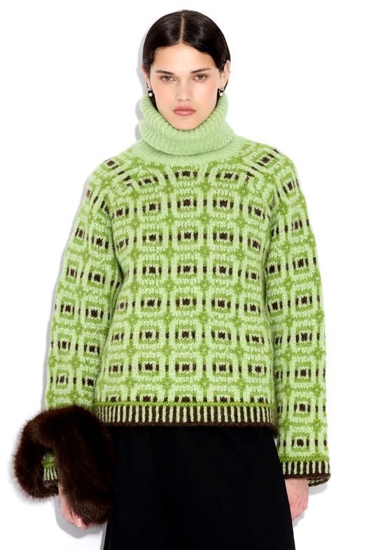 Вязаный свитер Roys — настоящий манифест уютного ретро-футуризма. Он сочетает в себе традиционную вязку и смелую цветовую палитру. Основной цвет — сочный фисташковый (или цвет зеленого яблока), который дополнен контрастными деталями. Геометрический орнамент, напоминающий стиль 70-х. Это повторяющийся мотив из квадратов и прямоугольников, создающий эффект «оптической иллюзии» или цифрового пиксель-арта. Это акцентная вещь в духе «библиотечного шика» или современной эклектики. Он выглядит одновременно и как винтажная находка, и как предмет из коллекции высокого модного бренда.