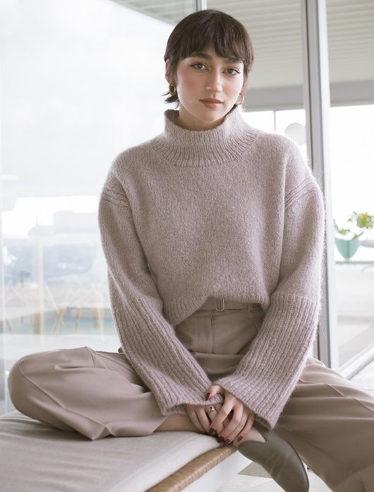 Роскошный свитер Wegner связан отдельными деталями, которые в конце сшивают. Плечевые скосы переда длиннее, чем плечевые скосы спинки, они оборачивают спинку, и формируют актуальный плечевой шов по направлению к спинке. Для воротника петли поднимают по горловине и вяжут его по кругу. Выбирайте размер с прибавкой на свободное облегание 6-10” по груди.