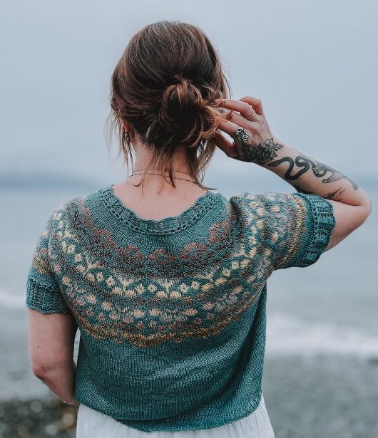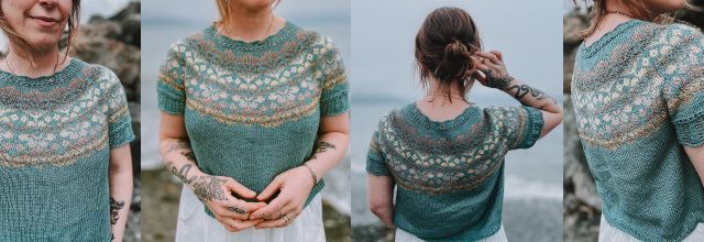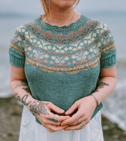 AlpineBloom – это легкий летний топ, вязаный сверху-вниз, украшенный милым ажурным узором по краю горловины и рукавов и цветным узором на кокетке. Укороченные ряды вяжут на горловине спинки для лучшей посадки. Ажурную часть рукавов вяжут отдельно и после присоединяют к основной части. В описании даны инструкции по удлинению тела по вашему желанию и по простым манжетам в резинку на рукавах, если вы предпочитаете не пришивать ажурный узор рукава.