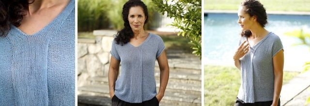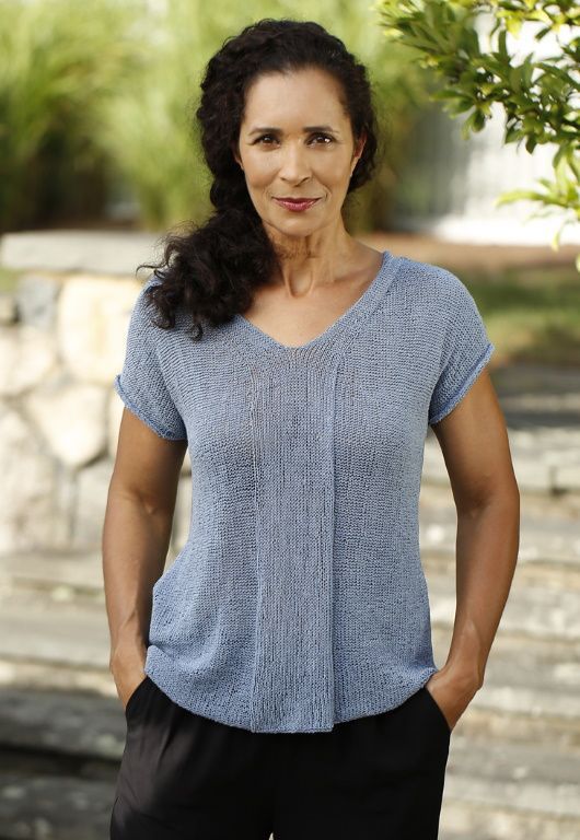Легкий летний топ Altiplano связанный из двух частей, украшен изящней полосой из лицевой глади, которая разделяется, образуя V-образный вырез и окантовку горловины на спинке.