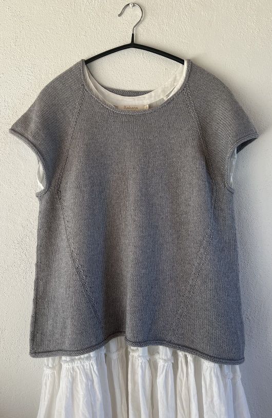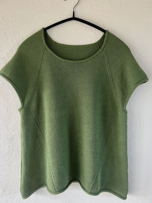 Легкий вязаный топ GreenTee вяжется сверху вниз с короткими рукавами реглан. Топ вяжется лицевой гладью. Линии реглана продолжаются вниз по телу пуловера, формируя наклонные линии. У тела пуловера небольшая трапециевидная форма, чтобы нижний край был достаточно свободным.