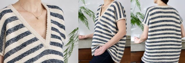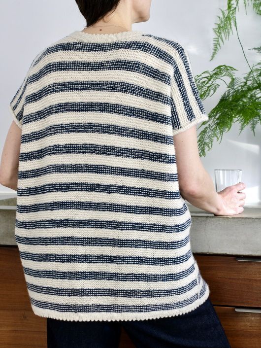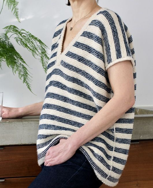 Свободный вязаный топ Joni сформирован четырьмя главными особенностями: широкий силуэт скомбинирован с узкими проймами и глубоким V-образным вырезом горловины с декоративным краем с пико. В дизайне предусмотрен большой припуск на свободное прилегание, окружность груди готового жилета приблизительно на 33 см шире, чем фактический обхват Вашей груди.