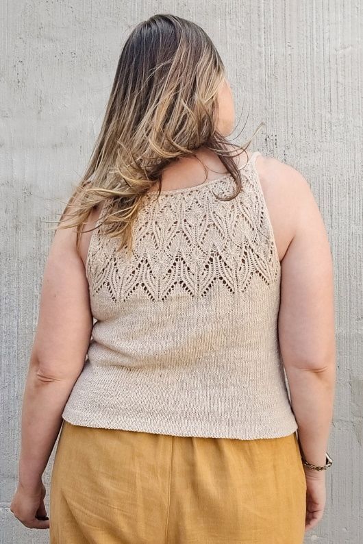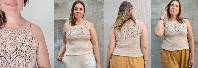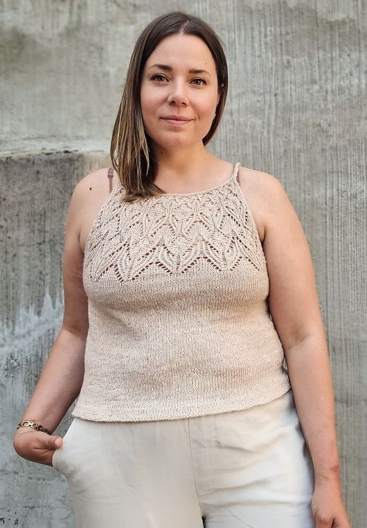 Вязаный топ Kuutar выполнен без швов сверху вниз с красивым ажурным узором спереди и сзади. Спинка и перед вяжутся отдельно до проймы. Затем детали соединяются и тело вяжется по кругу. Подол подгибается вдвое, что придает верху аккуратный и законченный вид. Верхняя часть переда и спинки отделаны окантовкой i-cord, плавно переходящей в бретельки. Верх Kuutar лучше всего подходит для пряжи из хлопка, вискозы или льна с хорошей четкостью стежка. Рекомендуется выбирать однотонные или слегка тональные цветовые решения, чтобы кружево было видно.