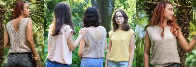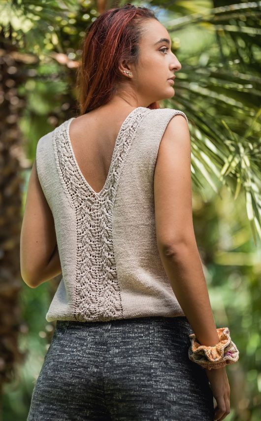 Вязаный топ Primavera с красивой ажурной спинкой выполнен по кругу снизу вверх, отделяется на детали переда и спинки, когда вы достигнете горловины спинки. Плечевые скосы соединяют способом трех спиц. Изделие связано без швов.