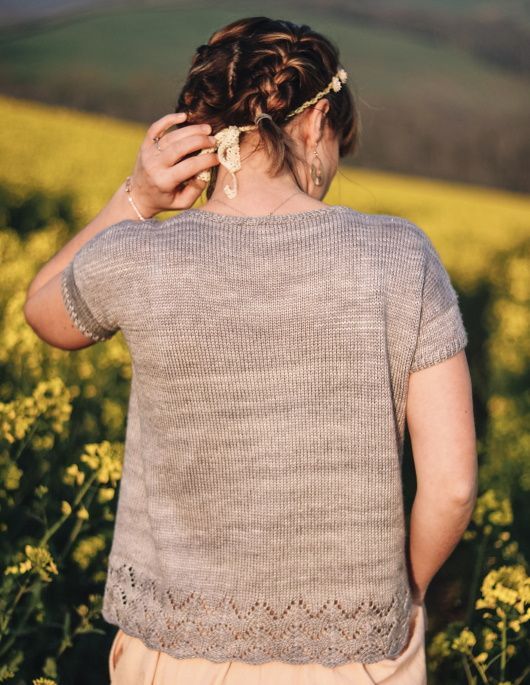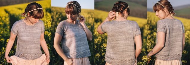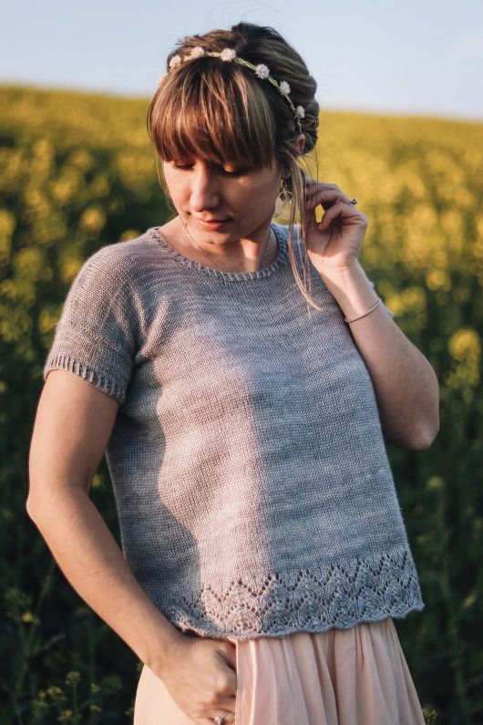 Rospico – это легкий топ, связанный лицевой гладью, с короткими рукавами и милым ажурным узором на нижней части тела. Этот ажурный узор вяжется очень быстро после ряда набранных петель и формирует слегка изогнутый низ. Топ связан снизу вверх.