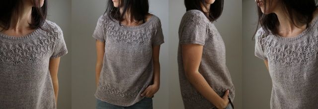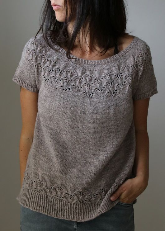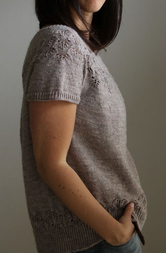 Топ Study вязаный по кругу сверху вниз без швов одной деталью. После резинки вяжут укороченные ряды для лучшей посадки. Затем кокетку формируют прибавками и далее вяжут ажурный узор. Рукава отделяют от тела и сначала вяжут оставшуюся часть тела. После поднимают петли рукавов и заканчивают их резинкой. Вы можете примерить топ по время вязания – просто поместите половину петель на ненужную пряжу.