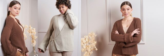 Элегантный вязаный жакет Pippa свободного силуэта, с запахом, завязками на талии, острым вырезом горловины, спущенным плечом и длинными вшивными рукавами с отворотами. Жакет полностью связан резинкой снизу вверх поворотными рядами из отдельных деталей, которые затем сшиваются вместе.