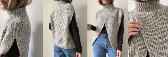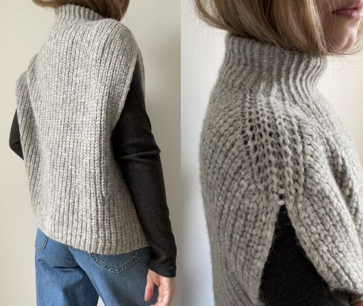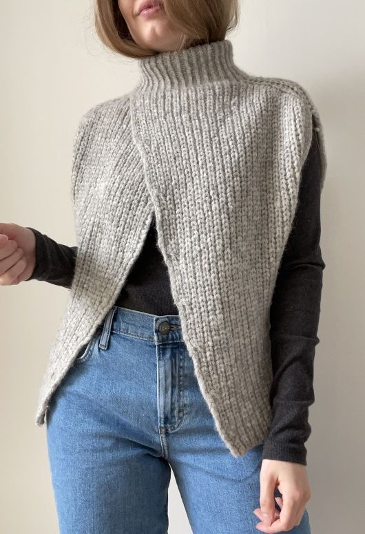 Nabi - мягкий и теплый жилет, вязаный из легкой и воздушной пряжи с альпакой, который согревает плечи и грудь. Жилет вяжется сверху вниз. Сначала вяжется горловина, затем поочередно вяжутся полочки. Затем вяжется спинка, которая соединяется с полочками у основания проймы.