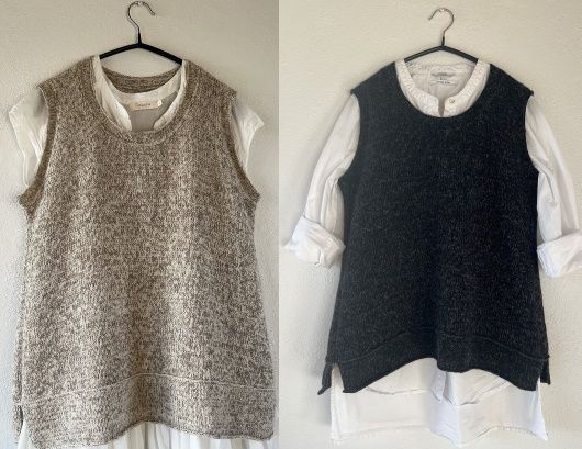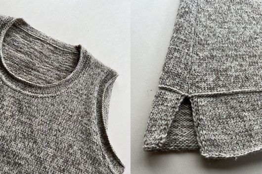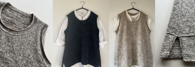 Вязаный жилет RAW выполнен сверху вниз. Начинают со спинки, где формируют плечевые сковы укороченными рядами. По набранному краю плечевых скосов поднимают петли для переда. Петли переда и спинки соединяют на уровне подмышек и тело вяжут по кругу до разрезов нижнего края. Края подчеркиваются горизонтальными петлями или поднимая петли с изнаночной стороны.