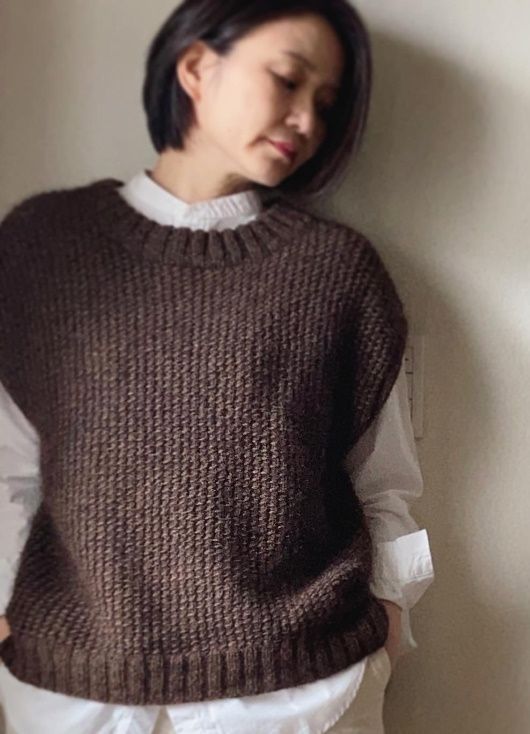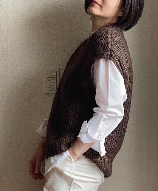 Удобный вязаный жилет Trifleс хорошей посадкой по плечам вяжется снизу вверх, легким текстурным узором. Сначала прямыми рядами выполняются нижние планки, затем работа продолжается круговыми рядами до проймы. Верхняя часть вяжется поворотными рядами вместе с планками пройм. Наконец вяжется воротник, который подшивается с изнаночной стороны, кроме этого больше никакой окончательной отделки нет. Спинка немного длиннее, чем перед, проймы глубокие.