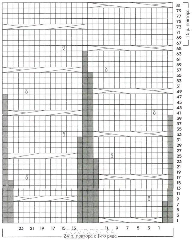26 п. и 24 р. = 10х10 см узором из кос по схеме.