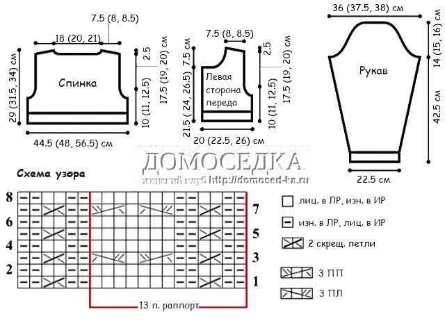Плотность вязания: 22 п. и 26 р. = 10х10 см основным узором спицами 6 мм.