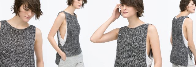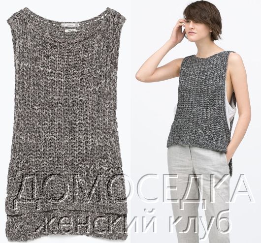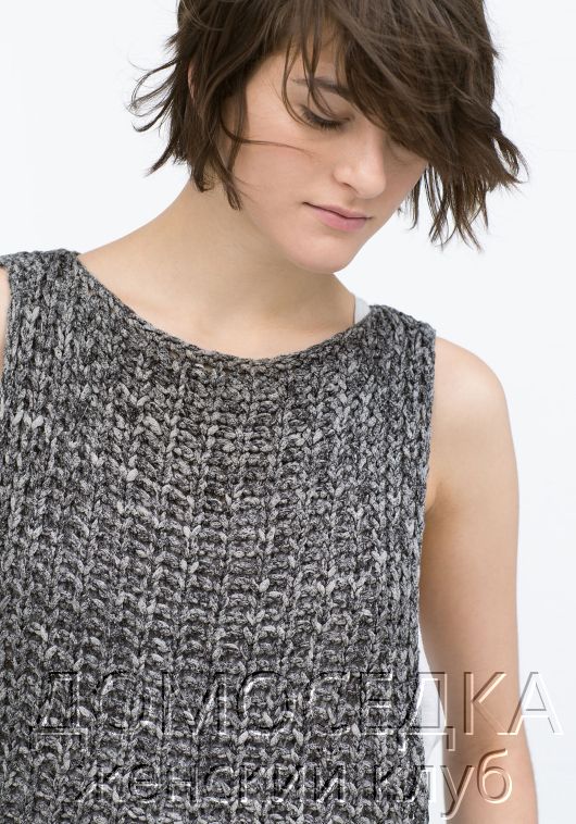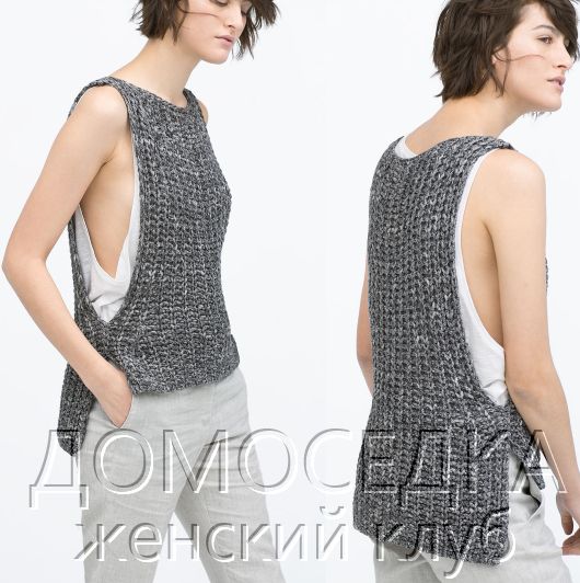 Стильная вязаная женская безрукавка от Mango с очень глубокой проймой и удлиненной спинкой выполнена спицами резинкой. Под безрукавку можно носить топ, майку или водолазку. Описание составлено по готовому изделию только для сайта Домоседка.