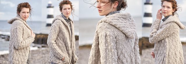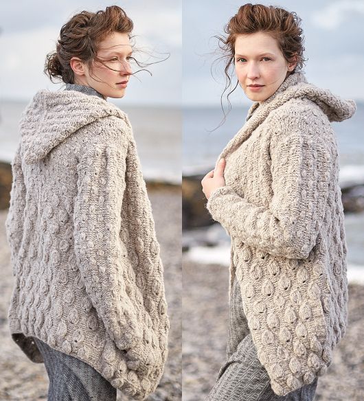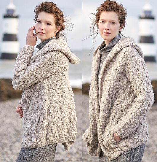 Теплая женская вязаная куртка с капюшоном COOKIE разработана Сарой Хаттон из объемной пряжи. Основной узор – рельефные листья и шишечки. Проект для продвинутых вязальщиц.